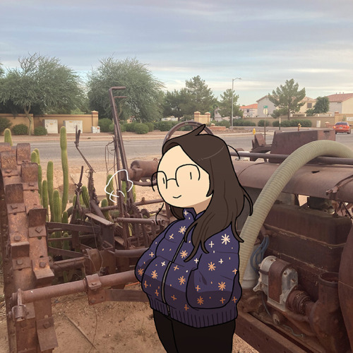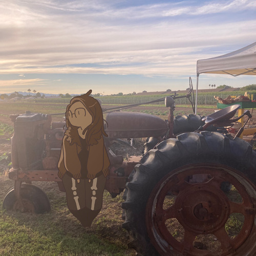 Description: A photo of some farm equipment. An illustration of myself stands in front, wearing a blue sparkly puff jacket. It’s getting a *little* chilly in the desert.