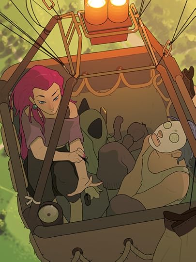 Description: An illustration of the Team Rocket hot air balloon. The camera is looking down into the basket, where Jessie is doing her nails, James is doing a face mask, and Meowth is napping. It’s a quiet scene.