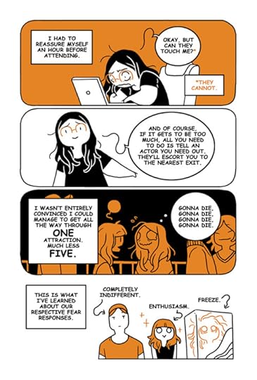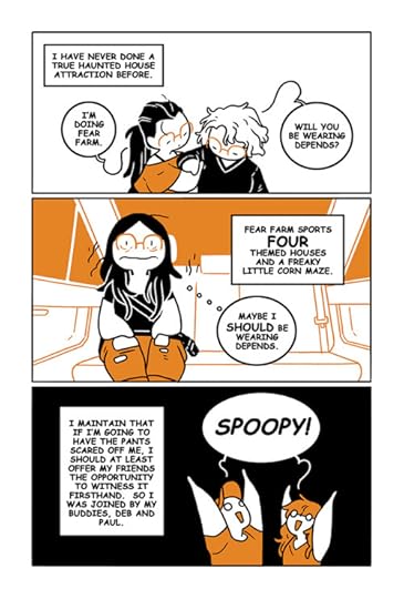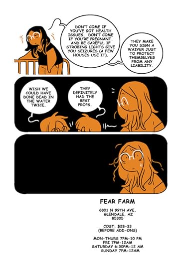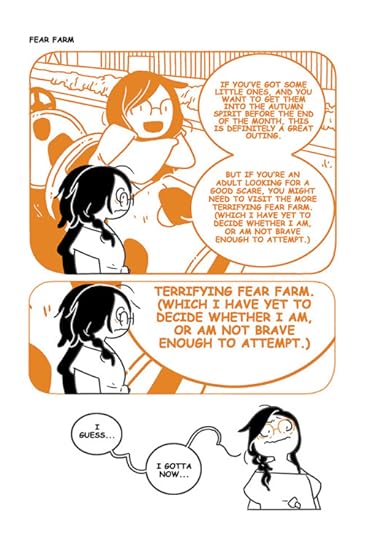 Panel1: A repeat of Page 3 Panel 2 from mycomic reviewing Tolmachoff farms. A morerecent rendition of myself stands in front of the panel, warily eyeing the textthat reads ‘But if you’re an adult looking for a good scare, you might need tovisit the more terrifying Fear Farm. (Which I have yet to decide whether I am or am not brave enough toattempt.)’