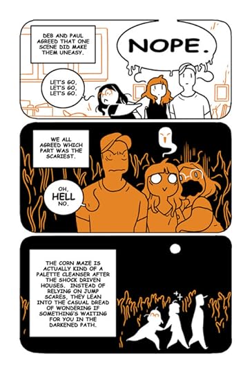CAPTION: The corn maze is actually kind of a palettecleanser after the shock driven houses. Instead of relying on jump scares, they lean into the casual dread ofwondering if something waiting for you in the darkened path.