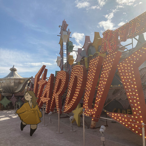 Description: A photo from the Neon Museum sign collection. An illustration of myself stands beside the ‘STARDUST’ sign. I am wearing a yellow velvet dress and black boots.