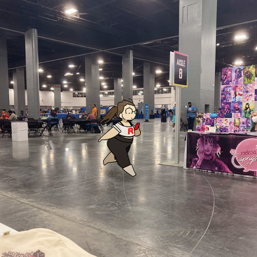 Description: A photo of a convention hall. An illustration of myself runs through while looking at my phone. I am wearing a Team Rocket shirt, black leggings, and white boots.