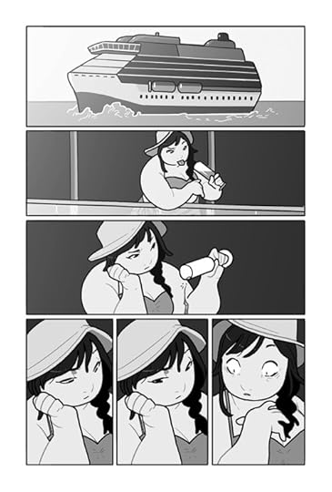Description: The first page of a two page comic. It is five panels showing a cruise ship. A woman is at the patio. She’s unhappy with her wine and letting the rest of it fall into the ocean. Something then catches her eyes.
