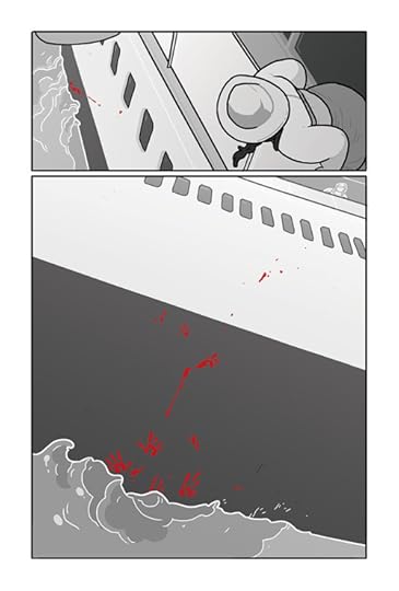 In the second page, two panels show the boat from different angles. As the woman looks down, we can see bloody hand prints smearing off the side of the boat and into the water.