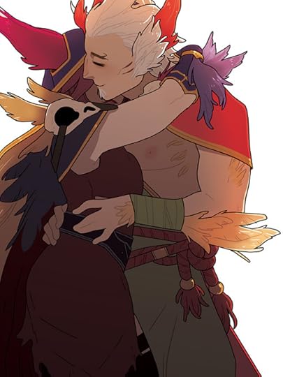 Description: Xayah and Rakan from League of Legends. They are embracing, with Rakan kissing Xayah’s cheek. The light is coming from behind them.