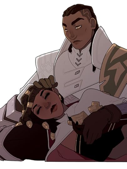 Description: An illustration of Lucian and Senna from League of Legends. Senna is sleeping with her head in Lucian’s lap.
