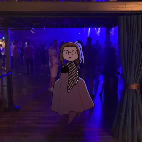 Description: A club lit up with blue lights. Away from the crowd a bit is an illustration of myself in a grey skirt, black tank, and fishnet shirt.
