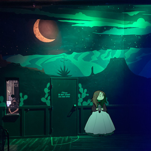 Description: A photo of a club lit in green light. The back wall is painted in a desert scene with cacti and mountains. An illustration of myself stands in front of the wall in a long puffy white dress, a black blazer, and a red tie. I am holding a water bottle. Hydration is important to clubbing.