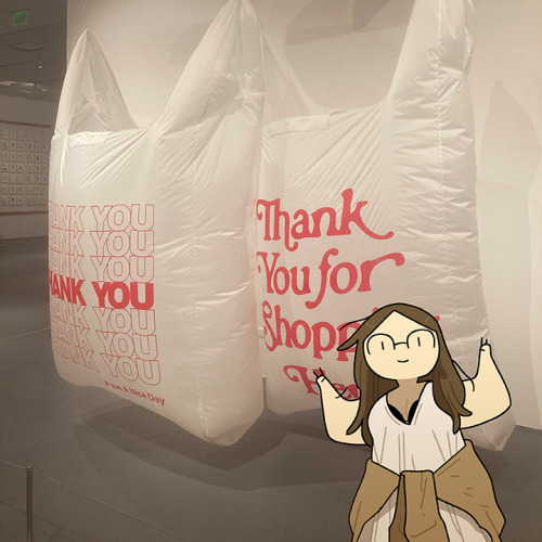 Description: A photo of an installation art piece at Wonderspaces Arizona. It features two giant ‘thank you’ and ‘thank you for shopping here’ plastic bags. An illustration of myself holding up two peace signs stands in front, smiling.
