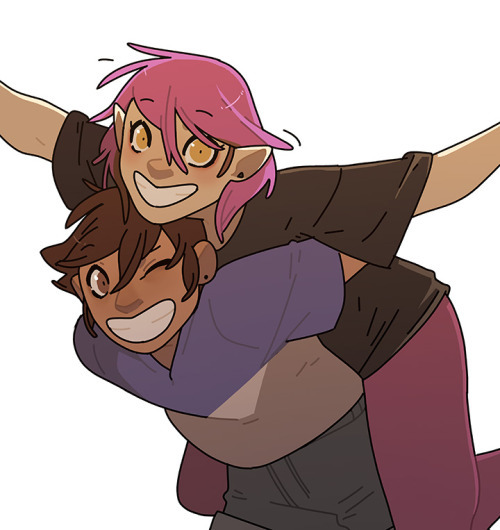 Description: An illustration of Luz and Amity from The Owl House. Luz is giving Amity a piggy back ride. They’re both grinning wide.