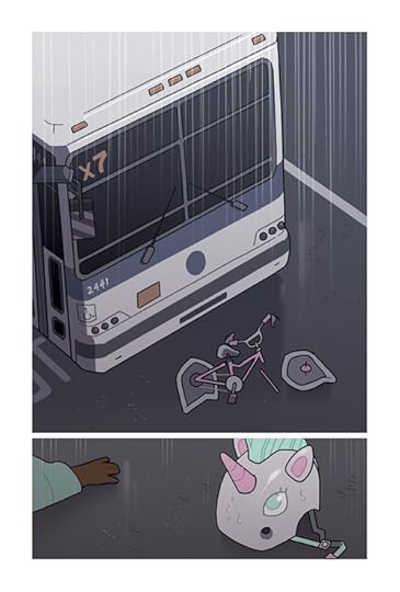 Description: A two panel page. The first panel shows a bus in the rain. In front of it is a broken bike. In the second panel, a unicorn helmet lies in the road.
