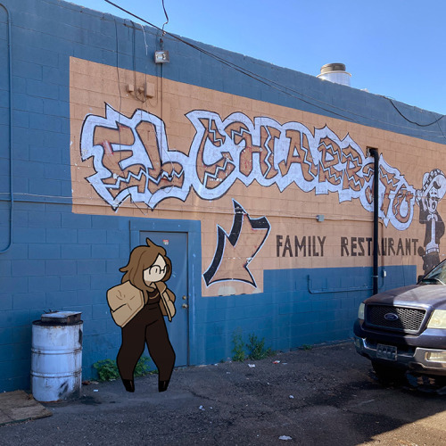 Description: An illustration of myself in a black outfit and brown coat. I am standing in front of a family restaurant’s mural that shows the entrance.