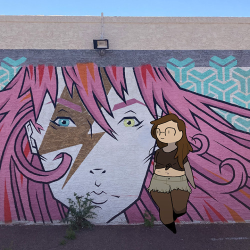 Description: A picture of myself standing in front of a mural. The mural is a giant face with a lightening bolt through one eye, reminiscent of David Bowie. I am wearing a black shirt, shorts, and tights.