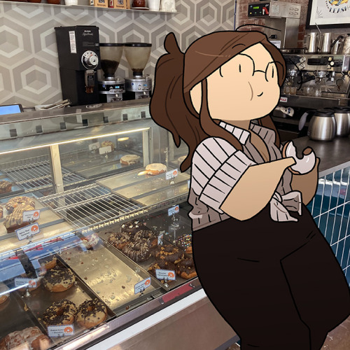 Description: An illustration of myself in black pants and a black striped white shirt. I am eating a donut while leaning against the display counter.