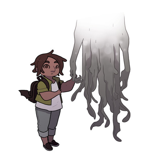 Description: A South Asian child in jeans, a white shirt, and a green overshirt, wearing a black bat backpack, holding hands with a feathery wraith.