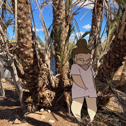 Description: A photo of a low to the ground palm tree. I stand in front of it in a simple white t-shirt dress that I am playing with.