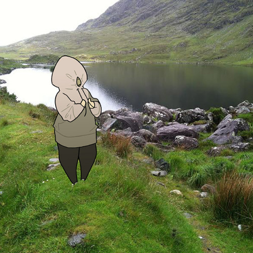 Description: A photo of a small lake, it’s rocky edge, and a handful of green mossy hills. I stand in the foreground in a grey sweater dress, pulling it’s strings so the hoodie completely engulfs my face. ^_^