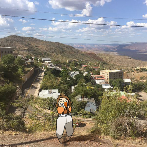 Description: A photo overlooking the town of Jerome. I stand in the foreground taking a selfie with the town below me.