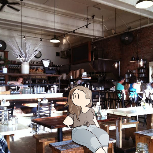 Description: A photo of a cafe awash in morning light. I sit at a bench closest to the camera.