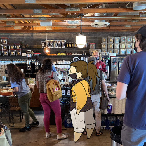 Decription: A picture of a cafe. I stand in line in white pants, a black polka dot shirt, and a yellow cardigan.
