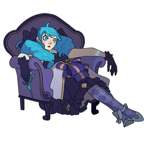 Description: An illustration of Gwen from League of Legends. She’s slumped in a purple chair, her scissors held limply in one hand.
