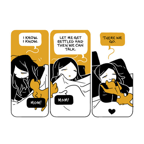 Description: A three panel comic. In the first panel I am crawling into bed as the cat yells at me. I tell her ‘I know, I know.’ In the second panel I am settling in and telling my still yelling cat to ‘Let me get settled and then we can talk.’ In the third panel we are snuggled together. I remark ‘There we go.’