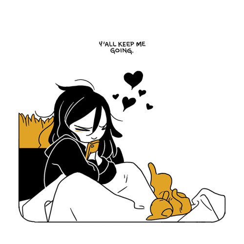 Description: A cartoon of me sitting in bed, holding my phone close with hearts floating by my head. Text reads ‘Y’all keep me going.’ My cat sleeps by my feet.