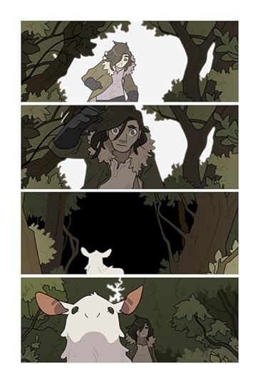 Panel 4: The camera turns so we can see the sheep’s face and the woman coming up behind it.