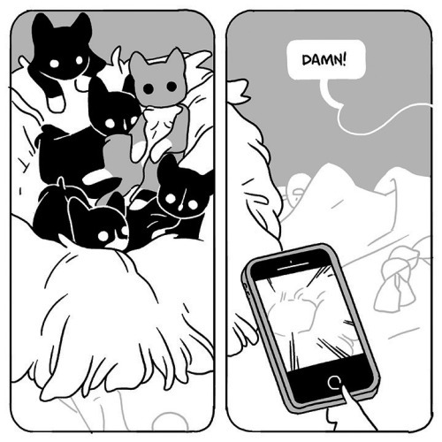 Description: A two panel comic. In the first panel we see all of my foster kittens being cute and chilling on their cat bed. In the second panel we see that I tried, and failed, to get a picture of them in their adorable glory. They have all jumped out of frame before I could snap a photo. I exclaim ‘damn!’ in defeat.