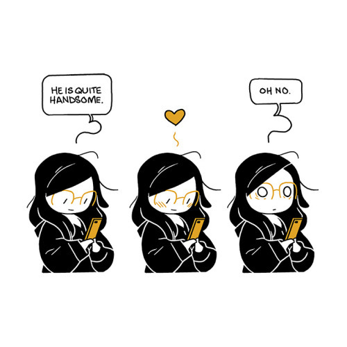 Description: Two three panel comics. In the first comic each panel is nearly identical with me looking down at my phone. In the first panel I remark ‘He is quite handsome.’ In the second panel I am blushing and a little heart has floated above my head. In the third panel I look up with a face of horror, realizing I have become infatuated and say ‘Oh no.’