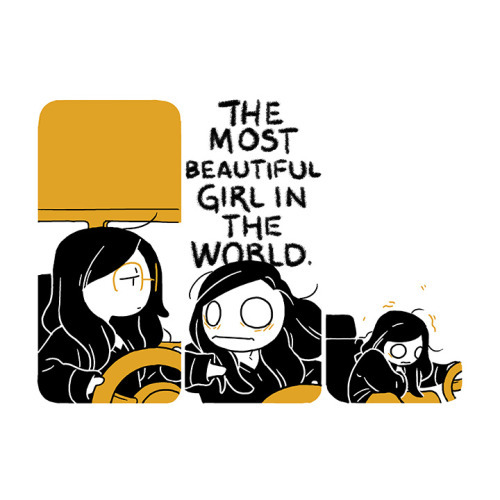 In the second comic I am driving, looking bored in the first panel. In the second panel I have turned my head quickly with huge saucer sized eyes. Text behind me reads ‘The most beautiful girl in the world.’ In the third panel I am hunched over and clutching my heart, trying to recover.