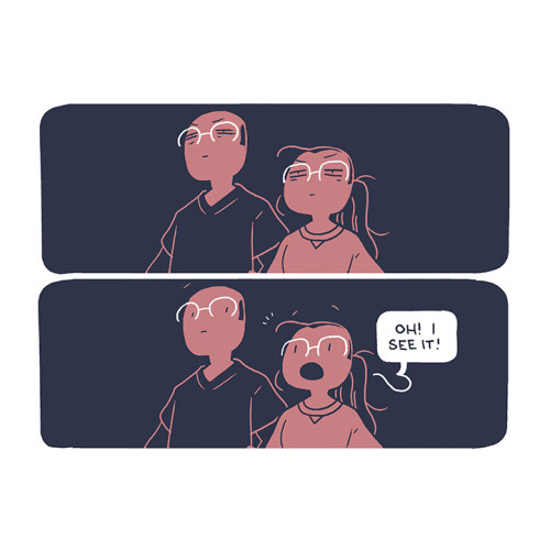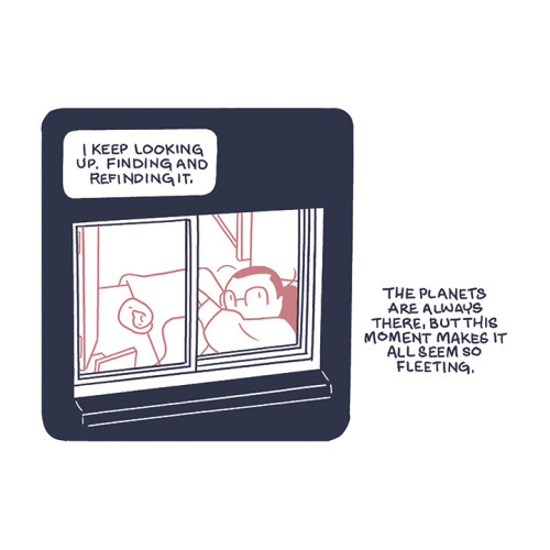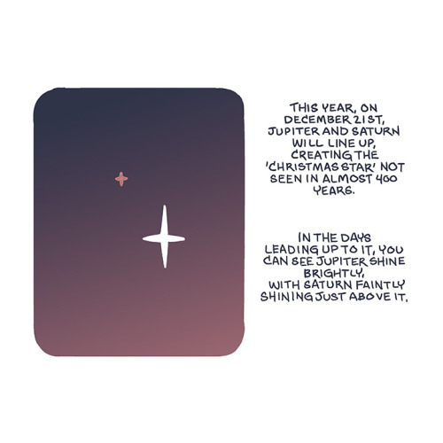 Description: A four panel comic. In the first two panels, me and my father are squinting at the night sky before I brighten and declare that ‘OH! I see it!’ In the next panel is the night sky with two stars. One bright one in the lower right center and a slightly dimmer one just above and to the left of the first one. Text reads: ‘This year, on December 21st, Jupiter and Saturn will line up, creating the ‘Christmas Star’ not seen for almost 400 years. In the days leading up to it, you can see Jupiter shine brightly, with Saturn faintly shining just above it.’ In the final panel I am closing my window and looking up at the sky. Captions read: ‘I keep looking up, finding and refinding it.’ And ‘The planets are always there, but this moment makes it all seem so fleeting.’
