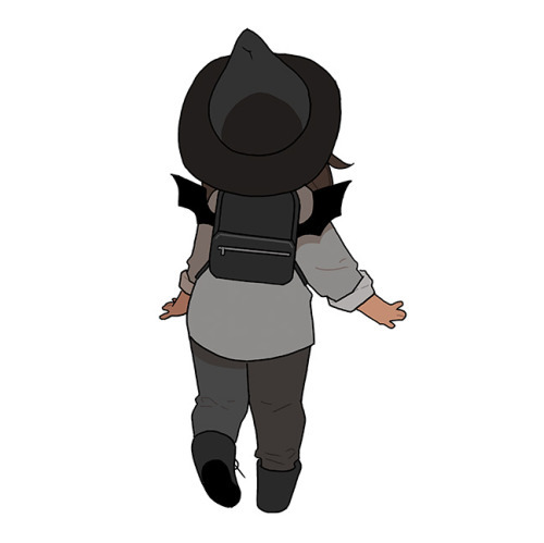 Description: An illustration of a little kid from behind. They are wearing a black witch’s hat and a bat backpack.