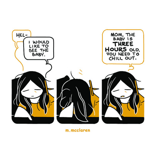 Description: A three panel comic. In the first panel, I have awoken to answer the phone. I barely get out a ‘hello’ before my mom is telling me she would ‘like to see the baby.’ In the second panel I put my head in my free hand. In the third panel I remind my mom that ‘the baby is three hours old and she needs to chill out.’