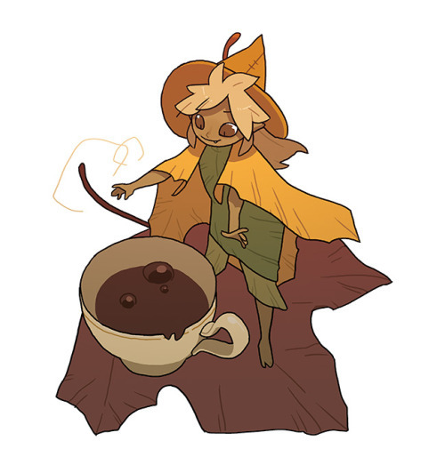 Description: A tiny faerie witch standing over her ‘cauldron’ tea cup. She is wrapped in leaves.