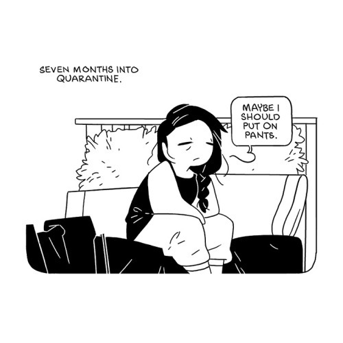 Description: I sit on my bed, bleary and tired. A caption reads: ‘Seven months into quarantine.’ I mused that ‘Maybe I should put on pants.’