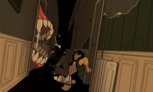 Description: A darkened hallway of an old house. A girl is plastered against the wall, looking frightened. Across from her, where there should be an open door, is a giant mouth full of sharp teeth.
