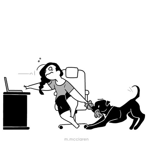 Description: An illustration of my foster dog Chiro playing tug’o’war with me, while I am in a rolly chair, and very easily pulling me away from my workstation.
