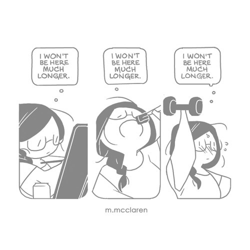 Description: A three panel comic. In one panel I am drawing on my cintiq. In the second panel I am eating sushi. In the third panel I am exercising. In all three panels my thought is the same: ‘I won’t be here much longer.’ It’s just a thought that sticks with you as you go about your day.