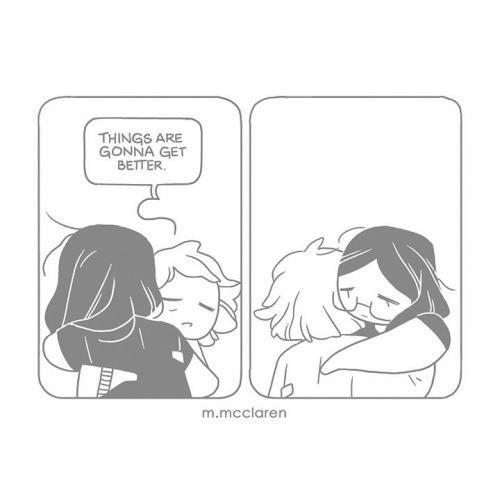 Description: A two panel comic. In the first panel I am hugging my mother, who tells me that ‘things are gonna get better.’ The camera shifts to show my face. I say nothing and am not overly hopeful.