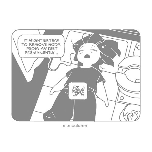 Description: An illustration of myself, lying on the bathroom floor beside the toilet. I look… unwell. A speech bubble with a group of angry scribbles sits above my stomach. And a text bubble says: ‘It might be time to remove the soda from my diet permanently…’