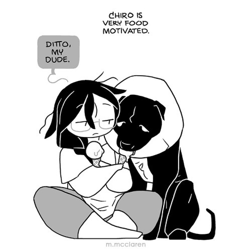 Description: An illustration of myself sitting beside foster dog Chiro as we both have at some ice cream cones. Text reads “Chiro is very food motivated.” to which I reply “Ditto, my dude.”