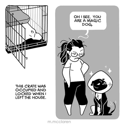 Description: A two panel comic. In the first panel there is an open, empty crate. Text reads “This crate was occupied and locked when I left the house.” In panel two I am looking down at Chiro, who is blameless in all things, and declaring “Oh I see. You are a magic dog.” Chiro sparkles faintly in his accomplishment.
