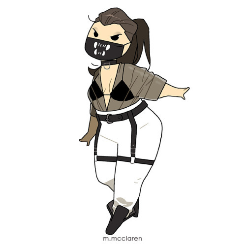 Description: An illustration of myself, wearing a black mask with teeth, a bikini top with a sheer black blouse, white pants with hip harnesses, and combat boots. It just sort of happened…