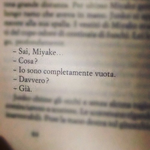 «You know what Miyake…» «What?» «I am completely empty.» «Yeah?» «Yeah.» Title: after the quake by Haruki Murakami