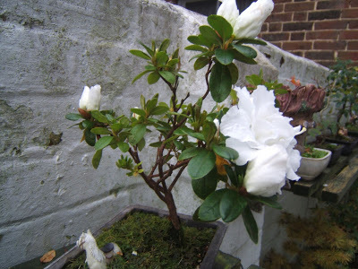 I was puzzled. How could such a spindly specimen bloom so abundantly in the middle of winter?So, in my bonsai collection, among all the healthy, vigorously growing trees, in pride of place is the white azalea. Six years have passed and it hasn’t grown at all, but it blooms in December without fail . The leaves look healthier though, so it isn’t dying.