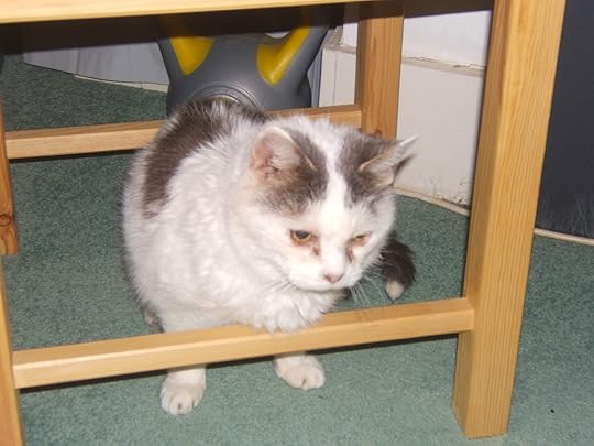 Monday morning arrived and I fully expected to find her dead, but she was still breathing, glaring at me from under my desk. I noticed that somebody had used the litter tray; hopefully it was Lulu and not Merlin.Breakfast was offered with a certain amount of trepidation, which turned out to be unnecessary as it was scoffed in record time. Nothing wrong with her appetite then which could only be a good sign. She still wasn’t moving very well, and I worried she might be in pain from arthritis. This was reinforced by the amount of hisses I received when I attempted to stroke her.Turned out to be just me she didn’t like, for Anita could stroke her all day without the sound effects.