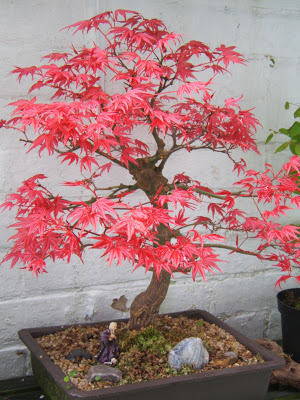 I wait patiently every Spring for the tiny buds to open, and the first growth is always this striking scarlet, followed later in the summer by a greener hue. I take great care of him and all my bonsai, (much to my family's amusement) but even they are impressed by this amazing performance!