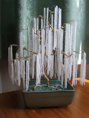 But... and this was a big one... I managed to finish one of my latest projects, the beaded bonsai tree you see above. It is entirely my own design, (although I must admit that the film Avatar influenced me greatly) It is approx 10 inches high and I used masses of the smallest beads I have ever seen. I first got interested in making these trees when I came across a lady in Covent Garden market who made similar trees, using tiny seashells instead of beads. Her trees were beautiful and have remained my constant inspiration. I especially like the notion that they cannot die from lack of attention or daylight. They don't lose their leaves in the winter, and they always look just right! That's an awful lot going for them, right there!