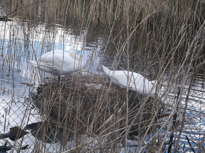 Half way around, I spotted the enormous white birds. One was sitting on the nest, a huge pile of twigs. The other stood guard, one eye on his mate and the other on me, lest I went too near. No fear of that really, the nest was way out in the water.
